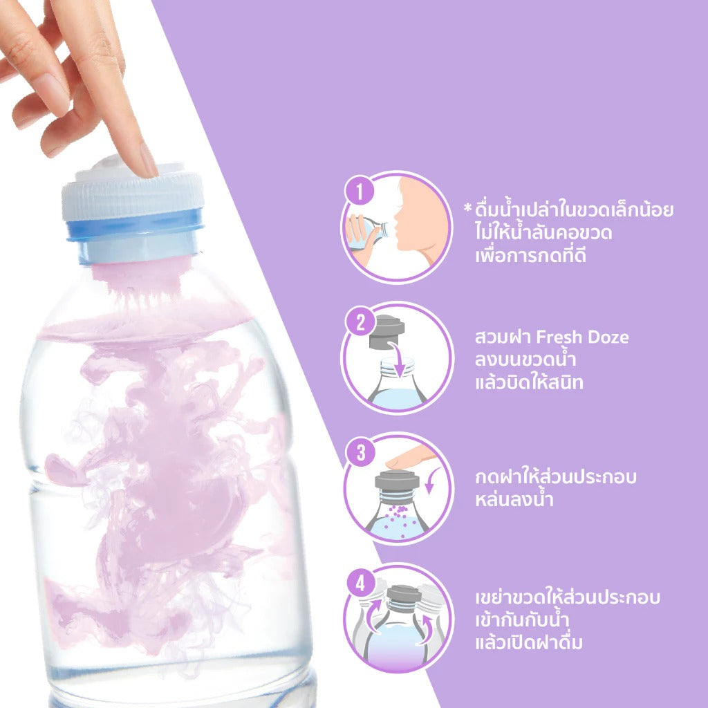 Способ применения: 1. Выпейте немного воды, чтобы она не переливалась через край бутылки и было легче закрывать крышку. 2. Плотно закройте бутылку с водой с помощью колпачка от Fresh doze. 3. Надавите на крышку, чтобы в воду попали свежие питательные вещества и витамины. 4. Встряхните бутылку, перемешав содержимое.