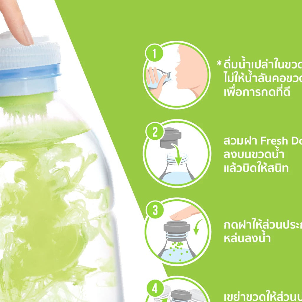 Способ применения: 1. Выпейте немного воды, чтобы она не переливалась через край бутылки и было легче закрывать крышку. 2. Плотно закройте бутылку с водой с помощью колпачка от Fresh doze. 3. Надавите на крышку, чтобы в воду попали свежие питательные вещества и витамины. 4. Встряхните бутылку, перемешав содержимое.