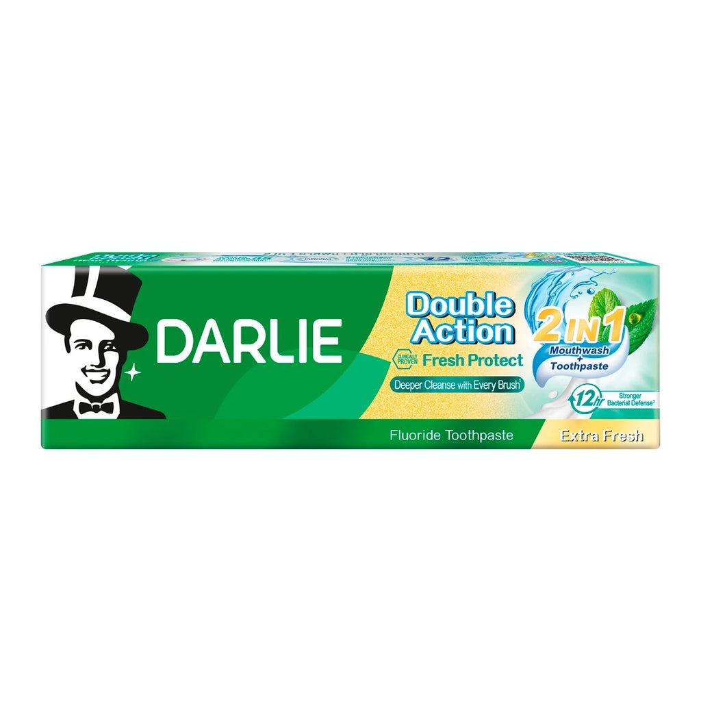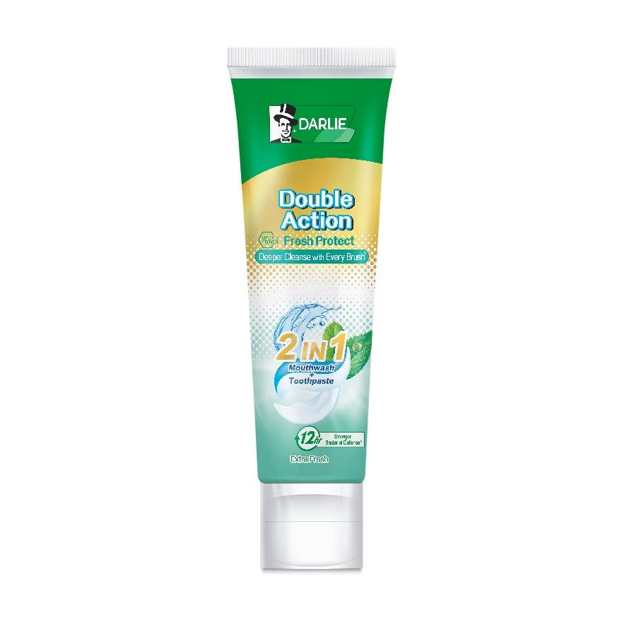 Инновационная зубная паста Darlie Double Action Fresh Protect 2 в 1 - уникальная формула, разработанная с использованием технологии LiquiDual, объединяет в себе силу ополаскивателя для полости рта и зубной пасты. Она обеспечивает глубокое очищение, проникая даже в труднодоступные места, и в 3 раза эффективнее удаляет зубной налет. Darlie Double Action Fresh Protect 2 в 1 обеспечивает защиту от бактерий на протяжении 12 часов, даря вам уверенность в свежем дыхании.