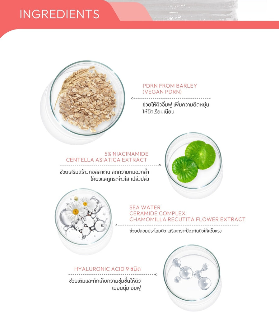 Инновационный восстанавливающий комплекс ПДРН (PDRN), извлеченный из ДНК лосося, имеет сходство с ДНК человека, обеспечивает питание и увлажнение кожи. Один из самых мощных ингредиентов против старения кожи. Увлажняет, укрепляет, омолаживает, поддерживает каркас лица. Служит профилактикой возникновения морщин, улучшает эластичность и тонус кожи.