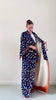 Витнажное кимоно длинное из фактурной ткани в темно-синем цвете, с фактурным рисунком на ткане и узором из кленовых осенних листьев.