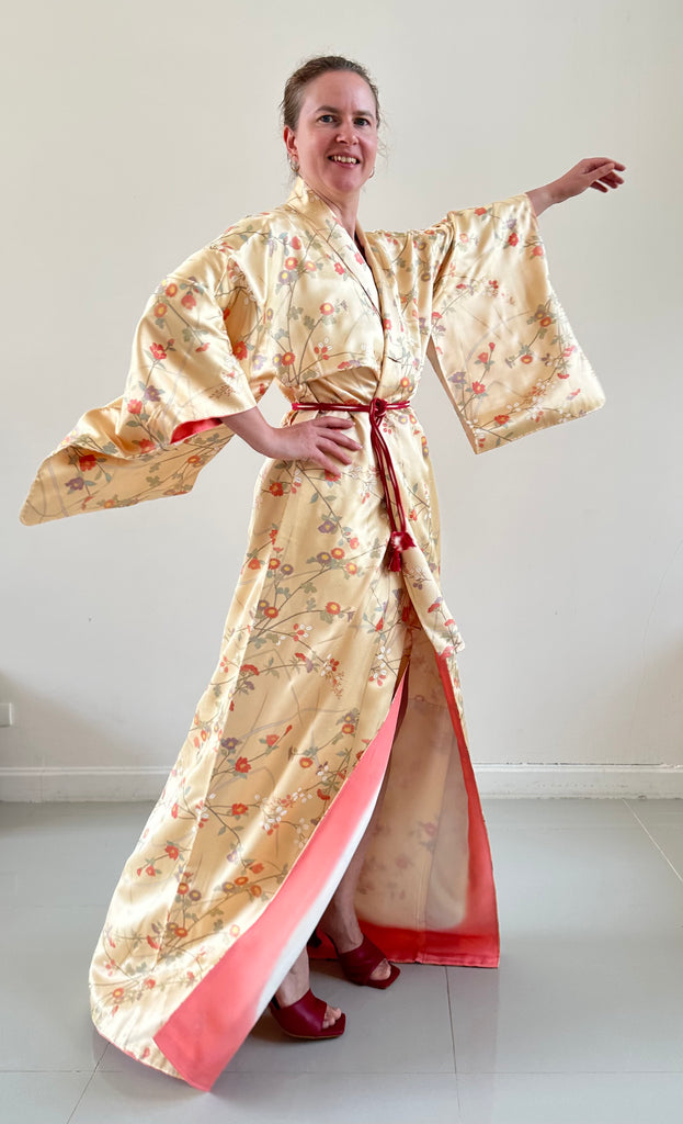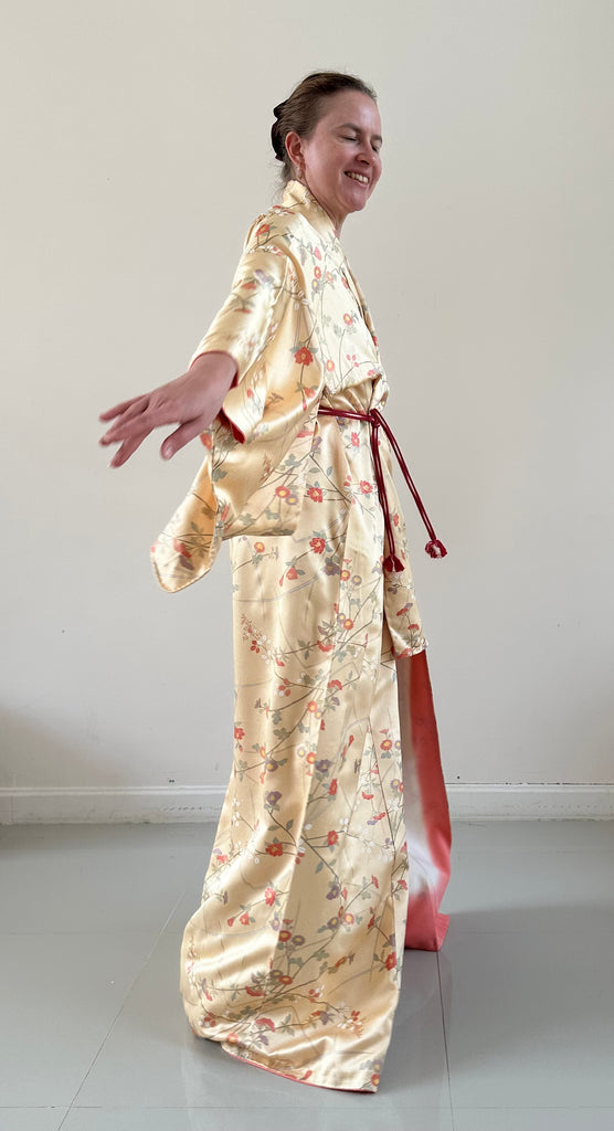 Винтажное кимоно из легкой, струящейся шелковой ткани, приятной на ощупь с фактурным рисунком на ткане и узором из цветов саккуры. Обладает мягким блеском, уникальной гладкостью и высокой прочностью. Подкладка - натуральный 100% шелк. Ручная работа.