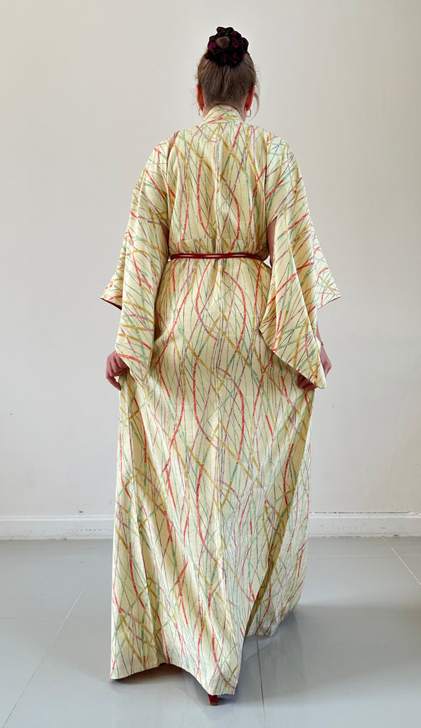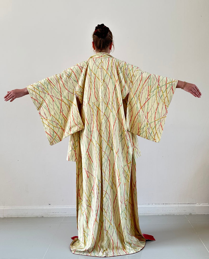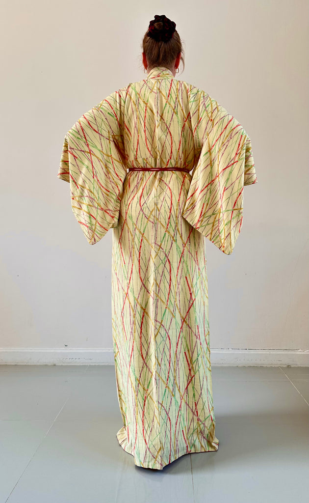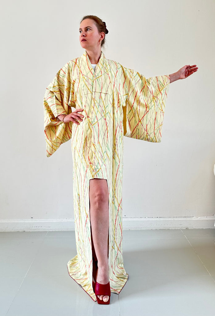 Silk Vintage Kimono (crepe de chine), Винтажное кимоно из шелка (крепдешин) в желтом цвете "Бамбуковый лес"